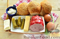 Включаем духовку. Температуру выставляем на 220-240 градусов и приступаем к формированию горячих бутербродов. Булочки нарезаем поперек на две половинки.