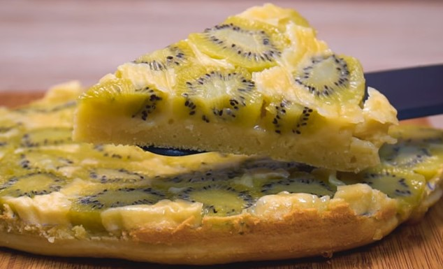 4. Блюдо для запекания промазываем маслом и выкладываем тесто. Сверху ровным слоем выкладываем киви.