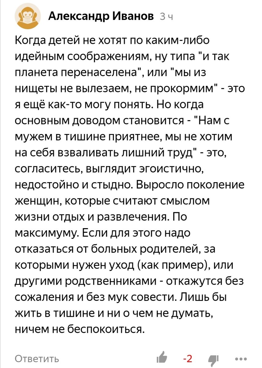 Ещё комментатор говорит о том, что якобы понимает, когда детей не хотят из-за бедности. Вот только люди, которые хотят детей, но позже, когда отложат немного денег/разберутся с жильем и т.д. не дадут соврать - их тоже достают. "Дал бог зайку - даст и фуфайку", "Ребенку нужна в первую очередь любовь", "У вас что, лишней тарелки супа не найдется", "Наоборот будет мотивация работать в 3 смены".