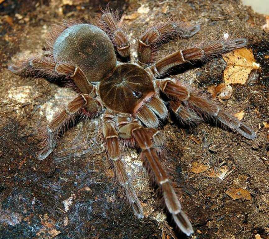 Птицееде-голиафе или терафозе Блонда. Именно он является одним из самых больших пауков в мире. Самки как всегда крупнее самцов. Длина их тела без лапок достигает 9 см, а у самцов – не более 8-8,5 см. Если же произвести замеры с расправленными ножками, то можно ужаснуться – ведь это все 25-28 см! Средством защиты, а заодно и орудием для добывания пищи являются огромные ядовитые клыки. Их длина