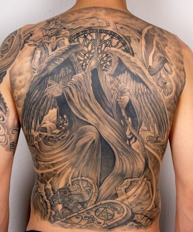 Довольно часто ангелов изображают в черно-белом реализме, такие работы получаются чувственными и пронзительными. Нередко в подобном стиле изображают тату падшего ангела в капюшоне. Обладатель такого рисунка зачастую выражает свою скорбь по поводу утраты близкого человека (иногда по своей вине). Тут как бы идет параллель между покаянием падшего Люцифера и обладателя татуировки. В черно-белой палитре очень символично смотрится тату ангелов и демонов. Порой они изображены в воинственных позах, а иногда обнявшись или держась за руки. Этим обладатель подобной работы показывает либо гармонию своей души (единство ангела хранителя и демона искусителя), либо же напротив — борьбу между добром и злом.