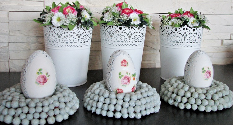 Разделите салфетку так, чтобы остался только один слой, обычно их три. Вырежьте узор и приклейте яичным клеем или ПВА.