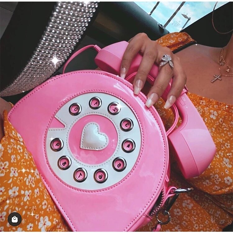 Итак, приступим! На первом изображении - безумно милая "мультяшная" сумочка в виде ретро-телефона. Так и хочется, набрать номер и позвонить кролику Роджеру! Полюбоваться ее можно тут: https://vk.cc/c0jur0