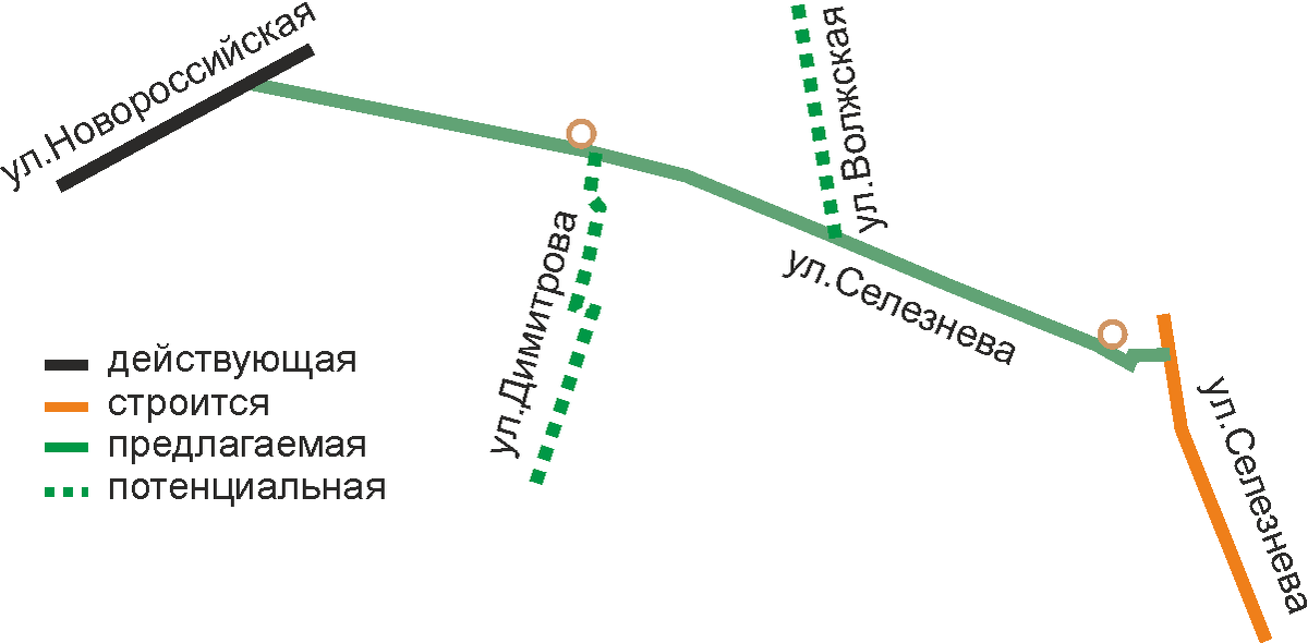 Как мы видим, в ближайшее время будет существовать два обрезка велодорожной сети - на ул.Новороссийской и на части ул.Селезнева. Вполне логично уже прям сейчас, во время проведения дорожных работ, их объединить в общую сеть.