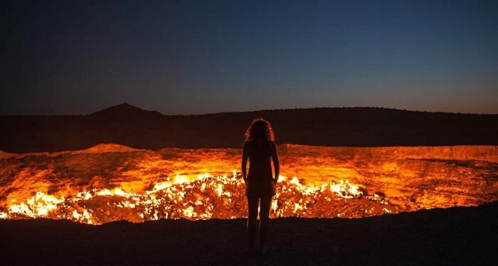 Газовый кратер Дарваза в Туркменистане известен как «Врата ада». Это месторождение природного газа в подземной пещере. В 1971 году геологи подожгли его, чтобы предотвратить распространение метана, процесс горения продолжается по сей день. Местные жители назвали Дарваза «Дверью в ад», из-за его кипящей оранжевой грязи в дыре диаметром 70 метров.