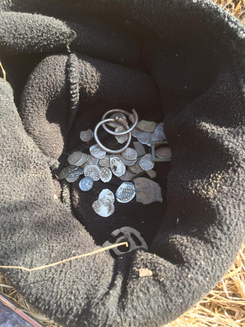 Двигаюсь постепенно линиями в сторону самой низины, которая с поля выходит почти к слиянию. Попадается копейка, на обратной линии рядом с этой копейкой в двух метрах еще одна, друг подходит с противоположной возвышенности и рядом цепляет еще одну, потом еще одну и так далее))) Все собираемся в одном пятачке))) В общей сложности 81 монета. Только один МихФед метрах в 15 от центра распашки. И из интересного еще - пропеллер. Все остальные Грозный и Смута. Первые мои Владиславы, Дмитрии и Василии (которые Шуйский, конечно))) В основном копейки. Шурф центра, к сожалению, дал всего монет 15. Но и так очень приятно. Тем более через день мы похоже зацепили еще одно место с 4 (пока четырьмя))) монетами Грозного. Но выезд пора было заканчивать и ехать домой. Теперь с надеждой готовимся к следующему выезду. В ближайшее время проверим и это место.