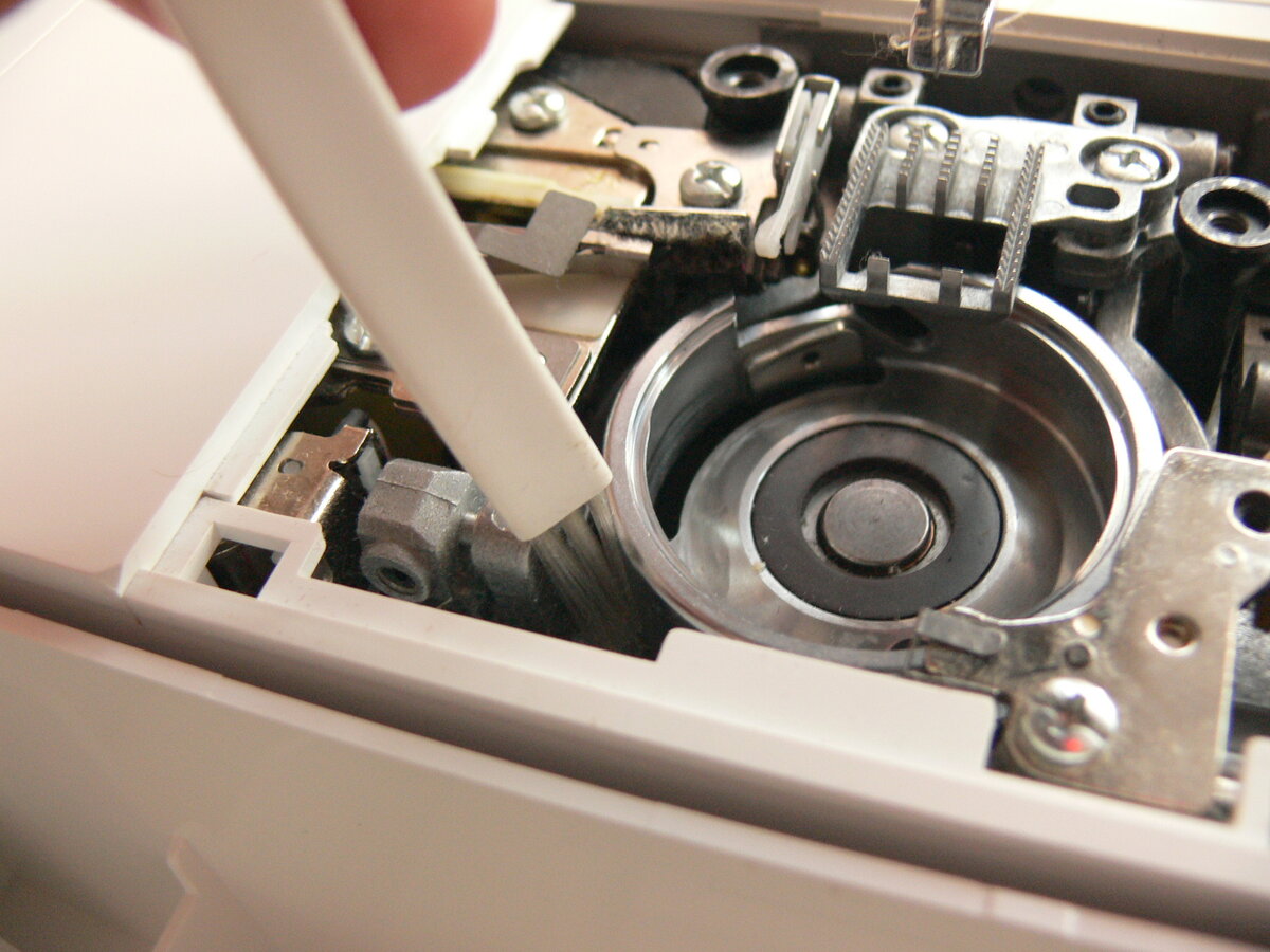 В него попадают и обрезки нити, скапливается пыль и многое другое. Поэтому чистить челночный отсек рекомендуется после каждого использования машины.