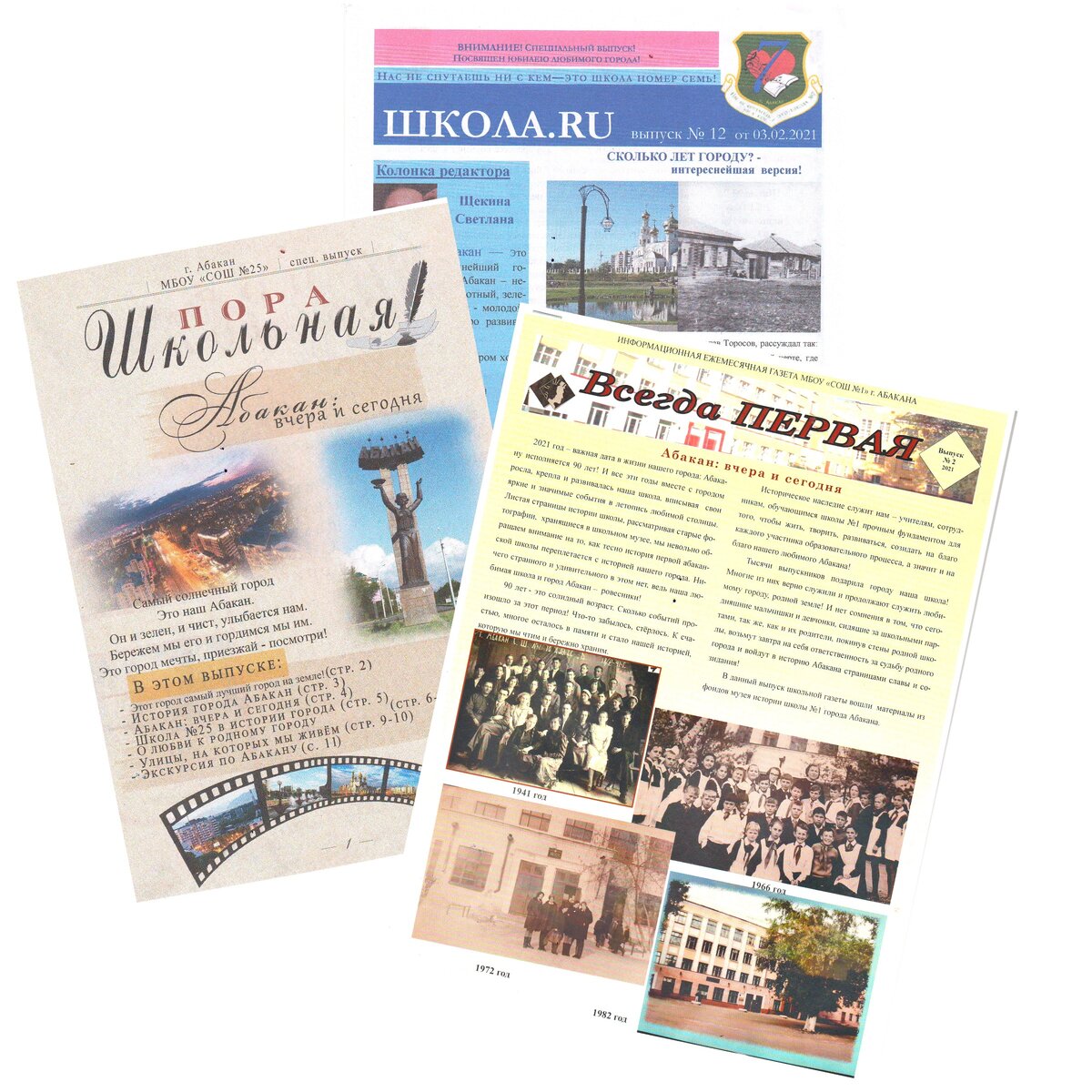 В колонке редактора газеты «Школа.RU» (школа № 7) Светланы Щекиной можно прочитать отклик души юного журналиста при создании газеты на знаменательную дату этого года: «Абакан — небольшой, тихий, зеленый, молодой, динамичный, быстро развивающийся город! Абакан — город, в котором хорошо и зимой, и летом! Этот выпуск создали дети. Мы постараемся показать Абакан детским, привлекательным для ребят разного возраста!» Школьники представили очень интересную информацию по истории поста № 1 в нашем городе, по открытию парка «Орленок».