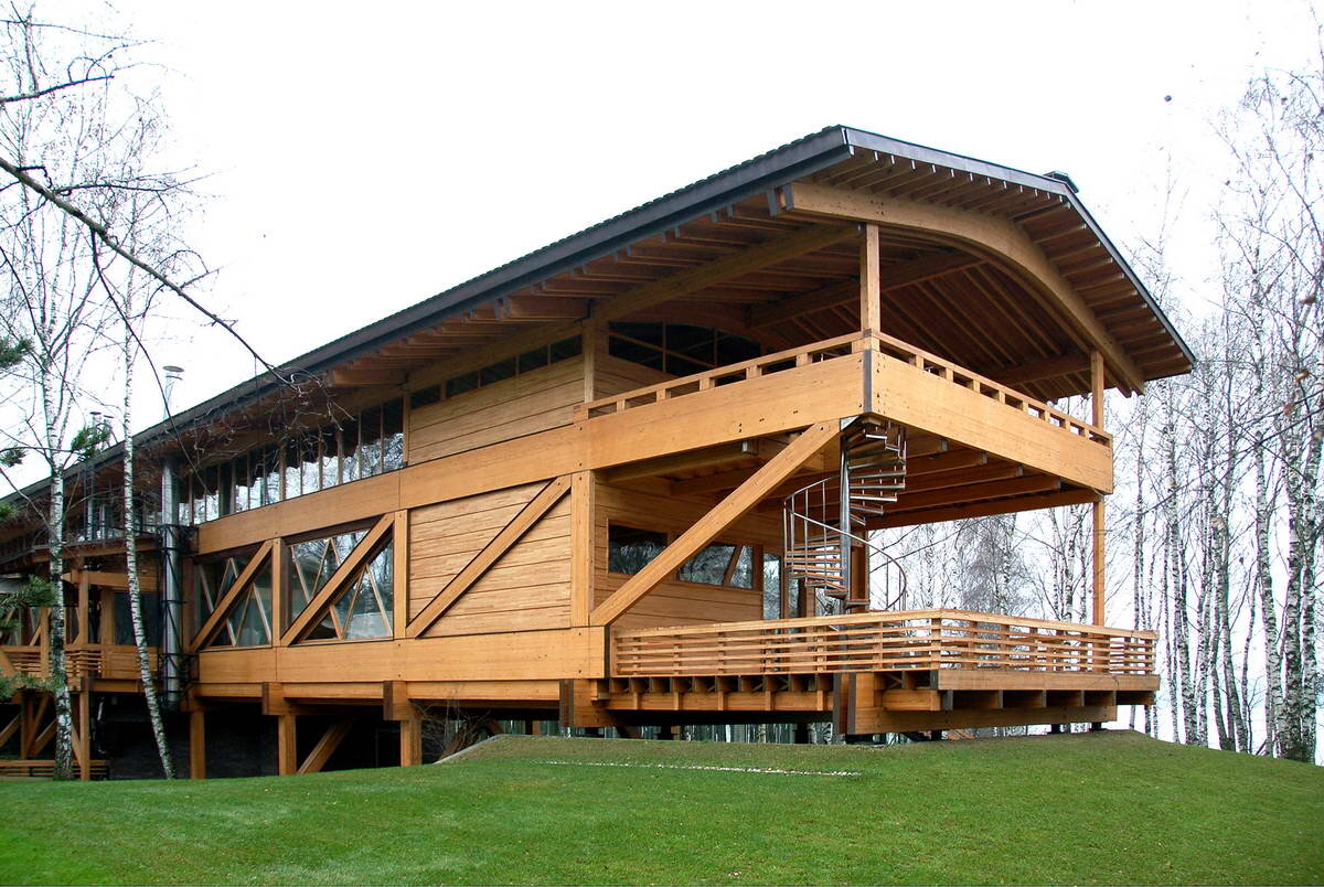 Дом-мост – индивидуальный жилой дом галерейного типа с бассейном, расположенный в живописном месте на берегу Клязьминского водохранилища, над оврагом. Тотан Кузембаев о проекте: «Дом-мост был нашим первым крупным проектом из дерева, на нем учились и экспериментировали. Главным образом нам очень повезло с заказчиком — он четко знал, что хочет получить в результате и готов был рисковать и делить ответственность за результат эксперимента...