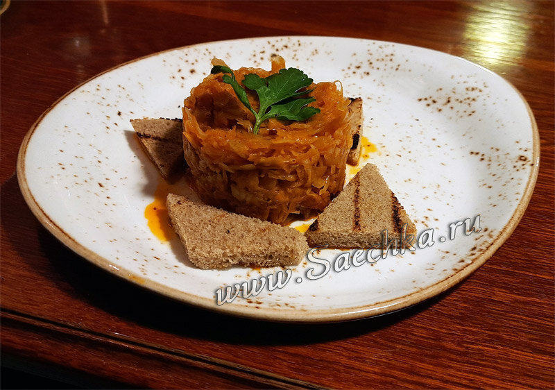- Тушёную квашеную капусту вкусно подать с обжаренными в тосте или на сковороде гренками.