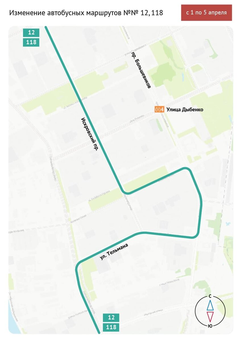 С 1 по 5 апреля, в связи с производством дорожных работ, закрывается движение транспорта на Искровском пр. (на участке от ул. Тельмана до ул. Крыленко), и изменяются маршруты автобусов №№ 12, 118.