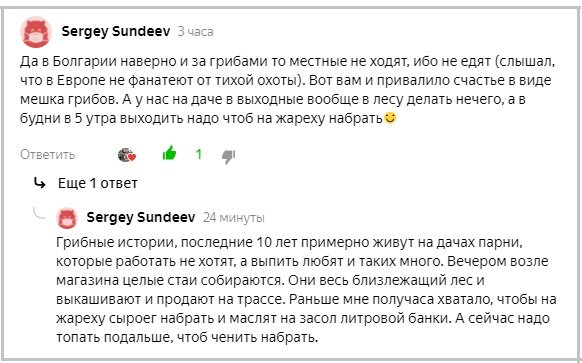 Да, в Болгарии, местное население практически не собирает грибы. Отучили их! Когда мы семья только переехали, частенько задавали местным вопрос: где здесь грибные места? В результате, слышали один и тот же рассказ: жил в Болгарии крупный специалист по грибам, а потом, сам отравился грибами-мутантами и вся семья погибла! Прямо страшилка какая-то!!! Думаю, запустили эту страшилку в народ, производители грибов, чтобы конкуренции не было…