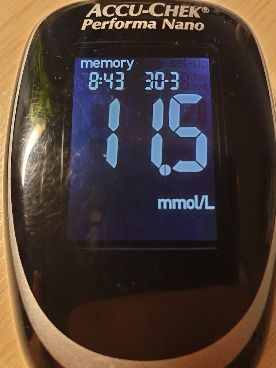 На завтрак сахар был 11,5 ммоль/л (повышенный). Мой завтрак состоял из бутерброда, кофе и шоколадки. Сегодня я пил обычное заварное кофе без сахара. Съел я бутерброд с двумя кусочками колбаски и 3 квадратика шоколадки Alpen Gold. Кофе я посчитал на 0,5 ХЕ, так как в кофе добавил молоко. Бутерброд у меня получился на 1 ХЕ и шоколадку на 1 ХЕ. По хлебным единицам у меня получилось 2,5 ХЕ. Инсулина