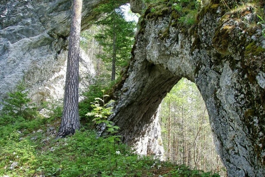 На севере Свердловской области есть удивительное место – так называемые Золотые (Царские) Ворота. Расположено это уникальное арочное образование на вершине скалы у берега реки Вижай. Внешне Ворота выглядят как две сквозные арки с диаметром отверстия чуть больше 4 метров и две сквозные пещеры шириной около 1 метра.