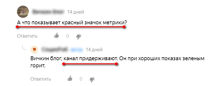 Например, из комментария видно, как автор канала, увидев, что значок Яндекс.Метрики горит "красным", делает вывод, что его канал "придерживают".