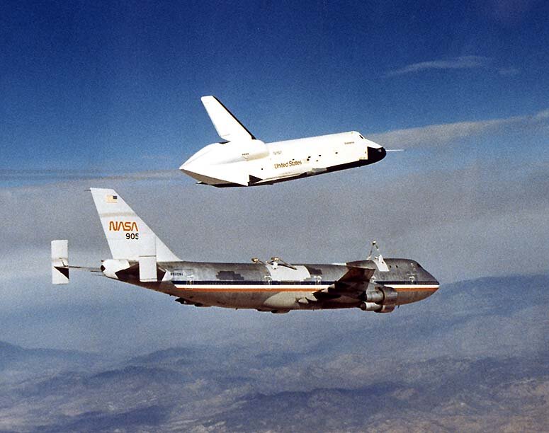 10. Первый испытательный полет. Космический шаттл Enterprise отделяется от Boeing 747 во время