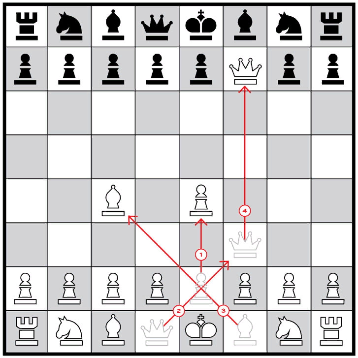 (ЧЕРНЫЕ) Если вы играете за черных, то пешкой Е на 5, слоном F на 5, потом ферзем D на 6, и последним ходом будет являться последний F на 2.