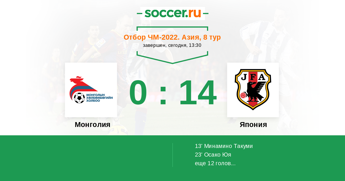 Сборная Японии возглавляет отборочную группу на ЧМ-2022 . Разница мячей после пяти матчей – 27:0. Матч с Монголией (14:0) был пятым в списке.