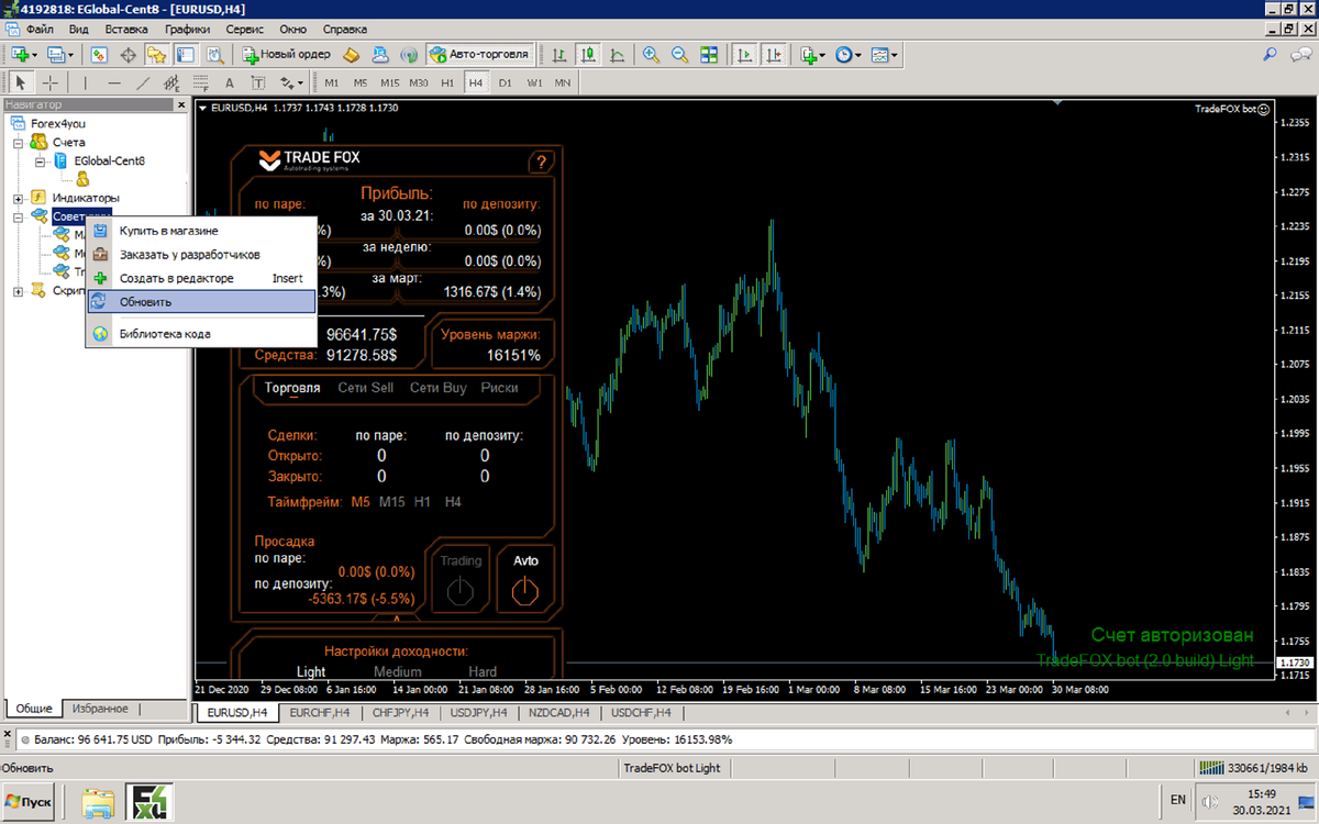 Шаг 2. Правой кнопкой мыши нажимаем на строку "Советники" далее "Обновить".