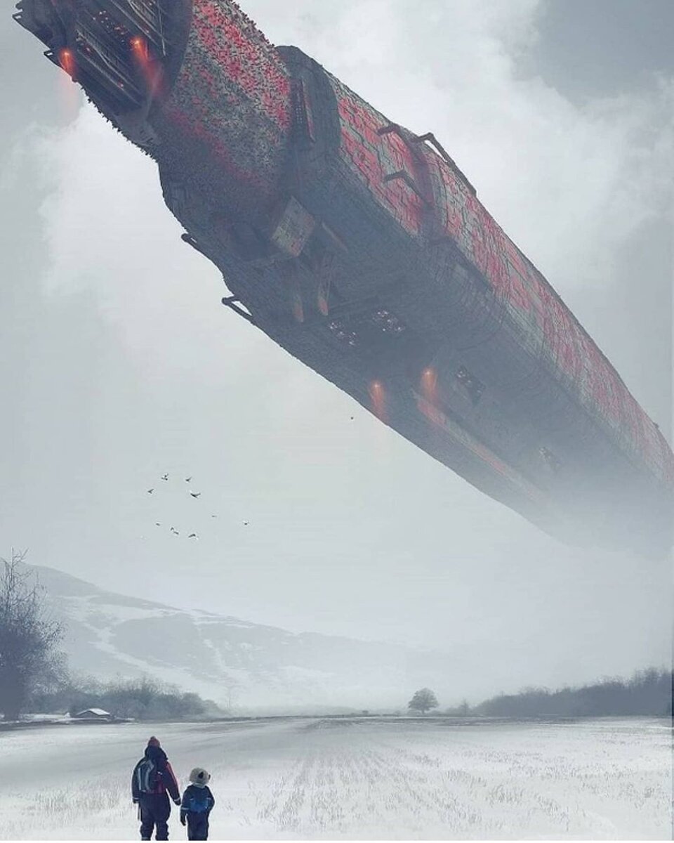 Так продолжалось несколько секунд, пока они не подняли глаза на небо. Над горами повис огромный космический корабль в виде сигары, и издавал такой сильный гул, что уши полностью перестали слышать.