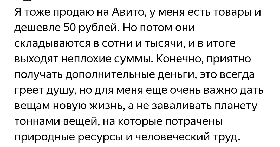После прочтения которого, я задумалась над словами автора комментария, очень верными и важными словами. Ведь действительно, на производство вещей затрачиваются огромные природные и человеческие ресурсы. Так почему бы нам не взять вышеуказанную позицию за пример, и прежде, чем отнести на помойку ненужную вещь (но которая при этом, еще может выполнять свой функционал и может кому-то пригодиться), не попытаться ее продать или отдать даром (кому как больше нравится), чтобы позаботится об окружающей нас среде.