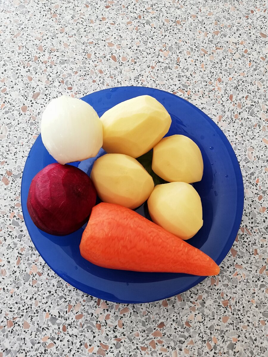 Пока картофель варится, чистим лук, морковь, свёклу и чеснок.