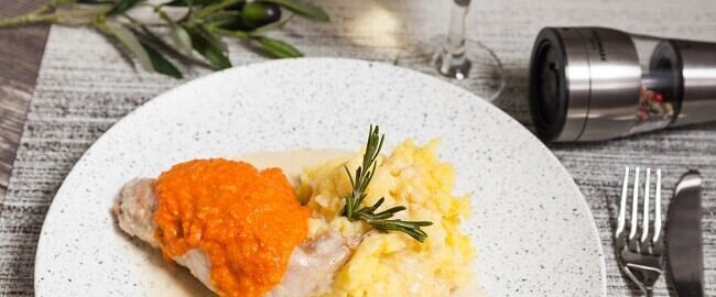 - Подача: на обеденную тарелку выложить кролика, на гарнир – лимонный картофель и сверху соус Ромеско. Украсить блюдо веточкой петрушки или розмарина.