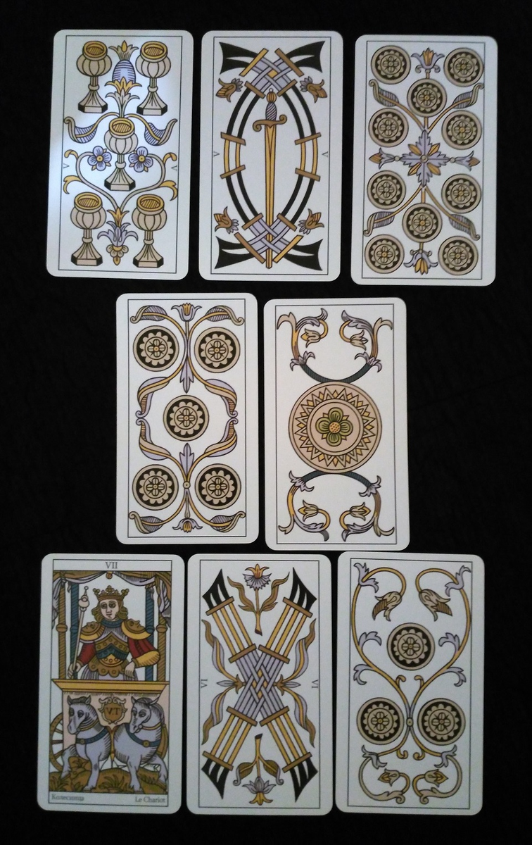 Пятёрка кубков повергнет нашего Стрельца в чувство разочарования. Видимо, он поймёт, что любовь и вообще отношения с людьми несколько не его стихия. А Пятёрка мечей ещё более усугубит ситуацию. Стрельца в буквальном смысле вырвут из отношений предательством или подставой (из отношений необязательно личных, возможно, рабочих). Ну и Десятка динариев даст возможность укрепить материальное положение, остаться в выигрыше, даже несмотря на подлость окружающих людей, ведь Стрелец в силу своей страсти к учёбе и перевариванию информации, как правило, ценный специалист и хороший профессионал своего дела. В первой триаде речь может идти как об испорченных отношениях на работе, так и о разводе с делёжкой имущества в пользу нашего Стрельца.