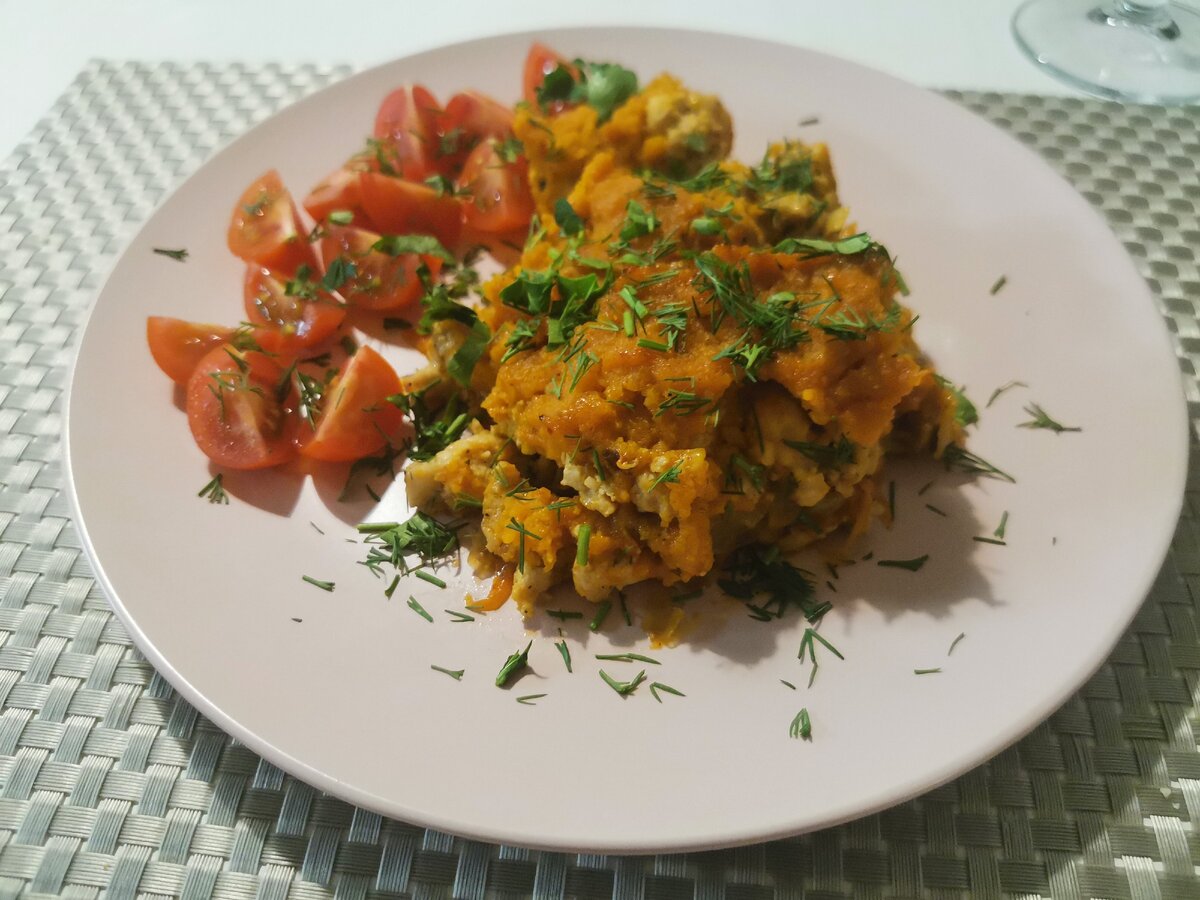 Извлекаем из духовки тыкву, пюрируем ее, добавляем соль, перец и паприку, тщательно перемешиваем и выкладываем в форму поверх мяса.