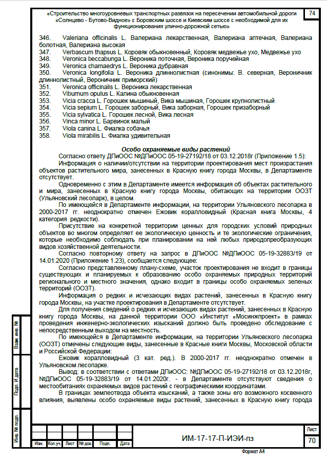 Проектная документация, разработанная на основании результатов инженерных изысканий, должна содержать как сведения о местах обитания охраняемых видов животных и растений, занесенных в Красную книгу города Москвы, так и перечень мероприятий по их сохранению, однако проектная документация ни в разделе №7 «Мероприятия по охране окружающей среды» (МООС), ни в разделе «Иная документация» том ИМ-17-17-П-МОРЖ (Мероприятия по охране растений и животных и среды их обитания) не содержит таких сведений , при том, что исходя из инженерно-экологических изысканий, реализация проекта в текущем варианте уничтожит местообитания редких видов.