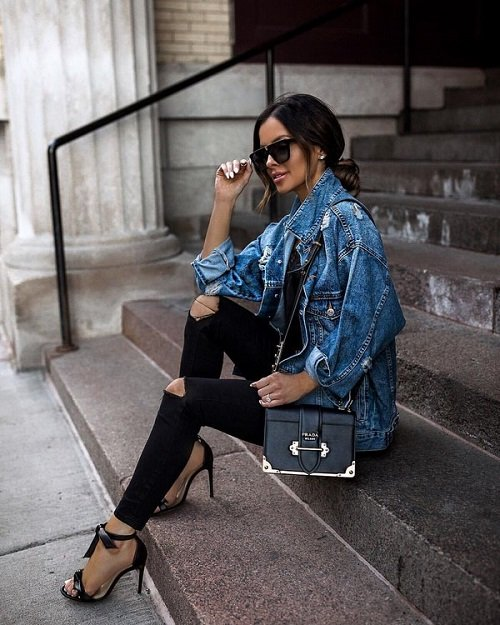Джинсовая куртка оверсайз просто идеально вписывается в офисный образ, особенно, при сочетании с блузкой и юбкой или брюками. Выбирать можно как обувь на каблуке, так и мега модной платформе.