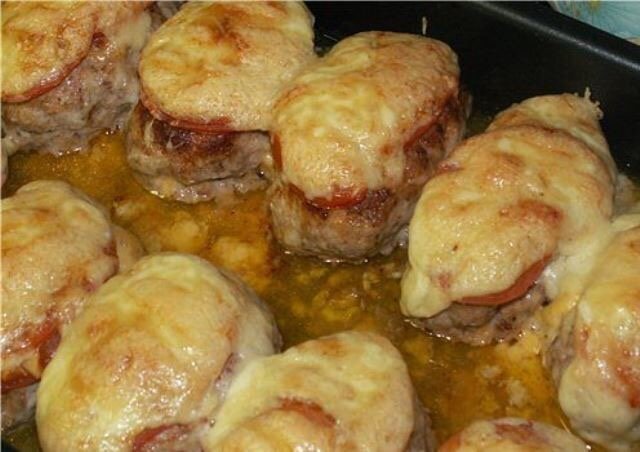 Помидоры порезать тоненькими ломтиками, выложить сверху на котлеты.
