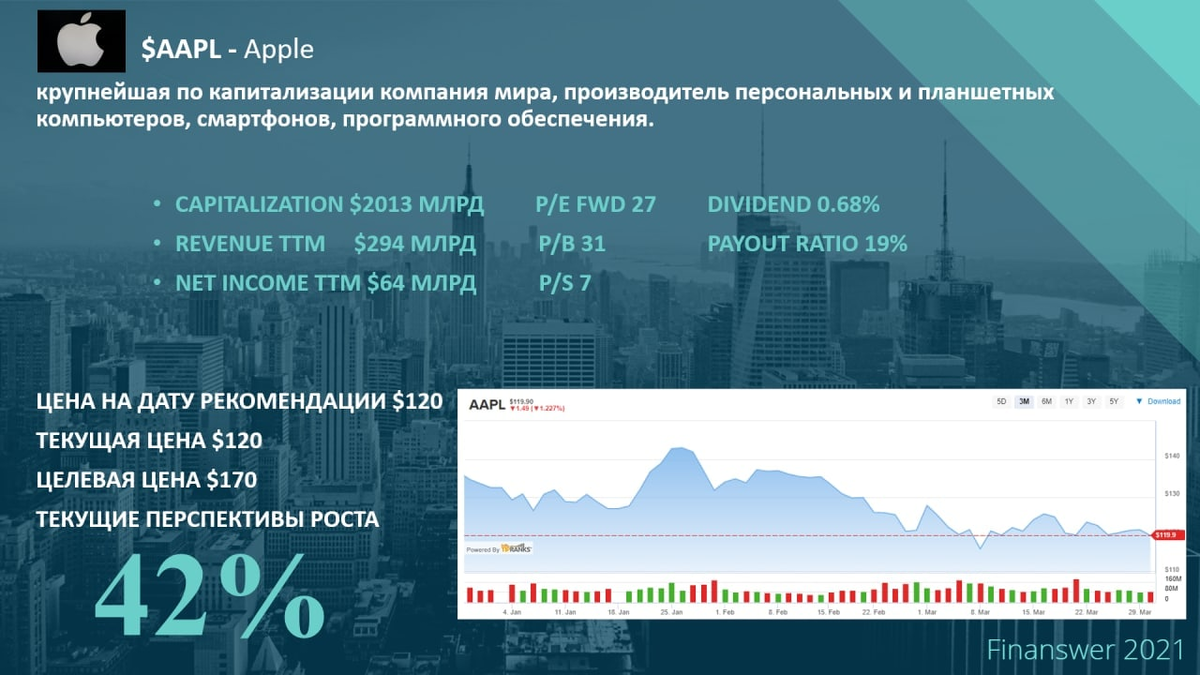 Добавляем в наш перспективный портфель ещё одну компанию. Компания знакома всем и каждому, это Apple $AAPL.