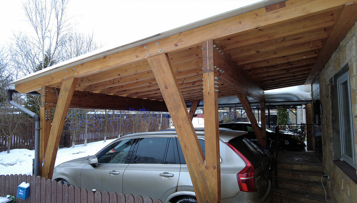 Мощные клееные балки в сочетании с металлическим крепежом придают стильный брутальный вид навесу