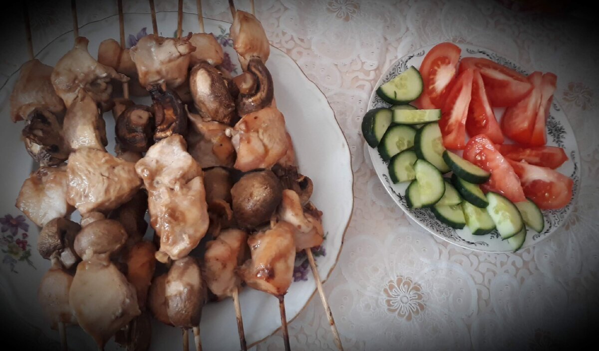 Дорогие друзья, хочу поделится с вами рецептом шашлычков из куриной грудки с шампиньонами.