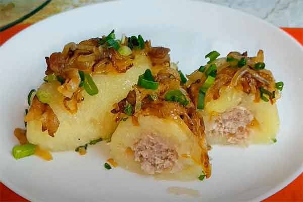 Готовые нежные, вкуснейшие картофельные галушки с мясом подать со сметаной и жареным репчатым луком или сливочным маслом. Сверху еще можно посыпать черным молотым перцем. Очень вкусно!