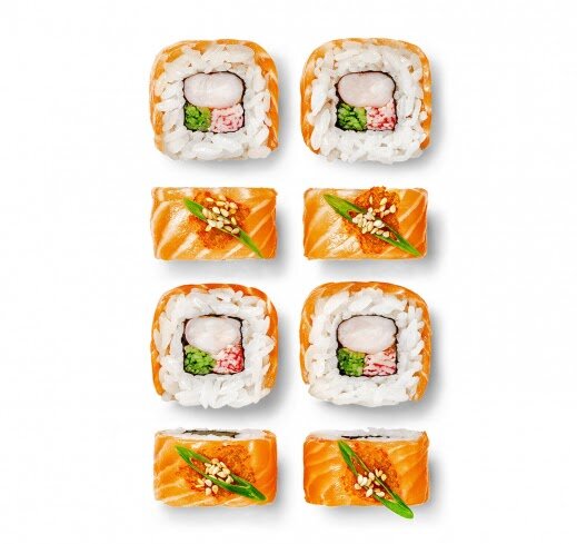 Королевское наслаждение для любителей морепродуктов: снаружи ломтик лосося, внутри краб-микс и аппетитная креветка. А сверху ролл украшен икрой масаго, тонким колечком зеленого лука и белым кунжутом — простое, но яркое сочетание.