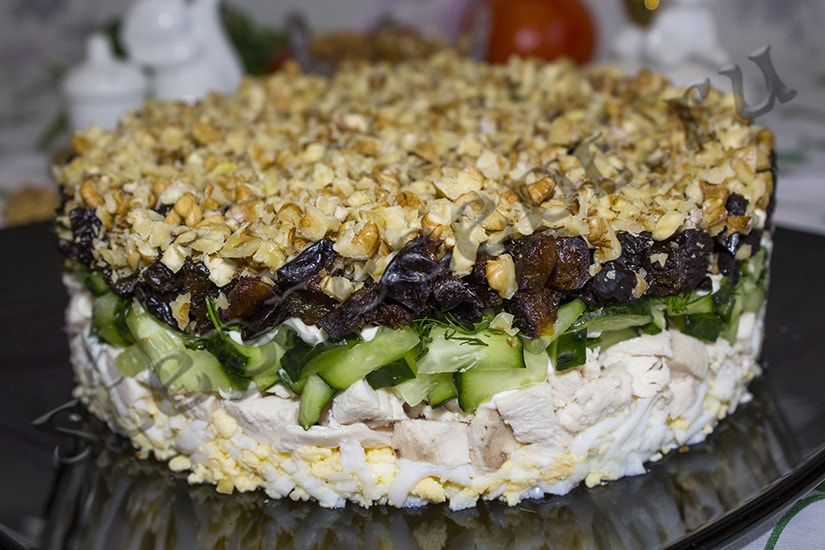 Еще один вкусный и легкий в приготовлении салат. Чернослив добавит ему пикантную нотку. Приготовление не займет много времени, а салат будет выглядеть оригинально. Такое блюдо украсит любой праздничный стол.