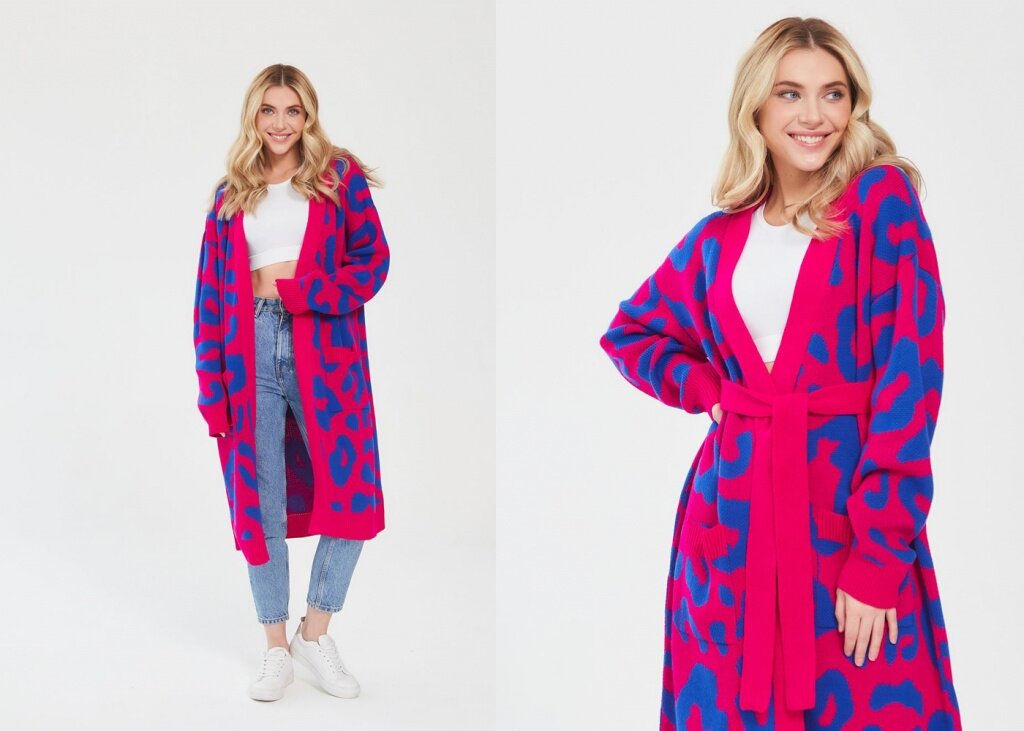 Под стать свитерам модный кардиган – это размер оверсайз, который дополняют объемная пряжа и рельефный орнамент. В зависимости от погодных условий дизайнеры предлагают комплектовать кардиган с водолазкой либо платьем из трикотажа, либо носить его «без сопровождения». Хит нынешней весны и грядущей осени – кардиган-пальто, согревающий и элегантный одновременно. Кардиганы нашей фабрики представлены под брендом Fluffy Shops на сайте WildBerries .