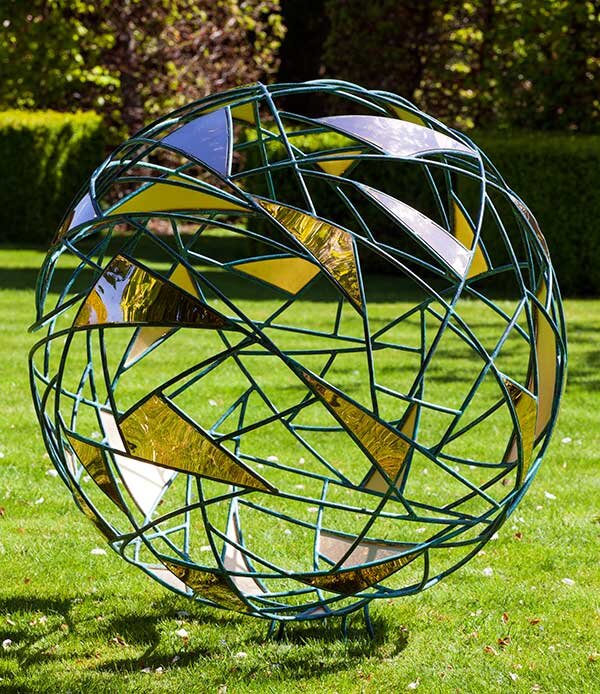 С водными растениями в пруду плавающие шары из стали просто великолепны, многократно отражаясь в зеркале воды.