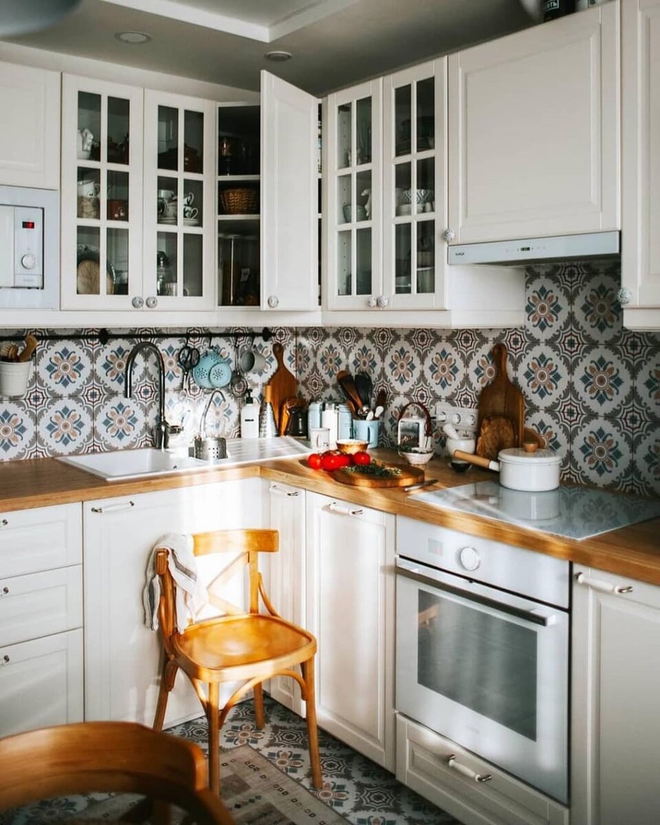 Прекрасная кухонька Дианы Багровой. Простые фрезерованные фасады, часть верхних шкафов — с застеклёнными дверцами, очень интересная плитка на фартуке.