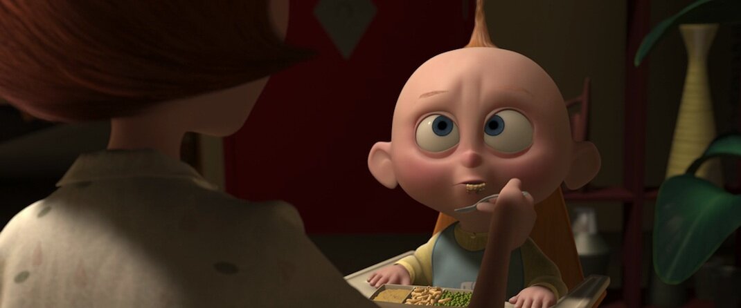 Замечательный кадр из-за плеча демонстрирует точку зрения, верхний ракурс, а затем камера поднимается, в то время как Дэш мгновенно садится на свое место, открывая нам всю семью за столом. Ощущение глубины стараются достигнуть в каждом кадре.