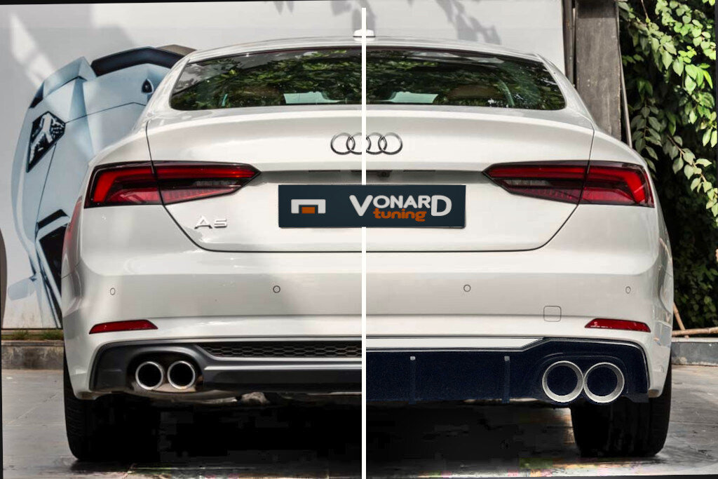 Вспомни как выглядит твой автомобиль Ауди А5 в кузове B9. Перед такой агрессивный с обострённо-усугублёнными формами, большая решетка радиатора в центре и мощные воздухозаборники по боками бампера, пороги вторят дизайну своими ломаными формами и идеально сочетаются дизайном с концепцией авто... обрати свой внутренний взор на задний бампер…. стильные светодиодные фонари, бампер, повторяющий