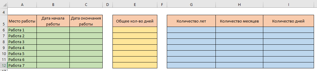 Для начала сделаем небольшую таблицу, в которую мы с Вами сможем занести основные данные из трудовой книжки. У нас получатся столбцы с местом работы, датой начала работы, датой окончания работы. Ещё нам понадобятся столбцы для самого расчета с общим количеством дней, с количеством лет, месяцев и дней отработанного периода. И все это дело заполним. Вот, что у нас получилось.