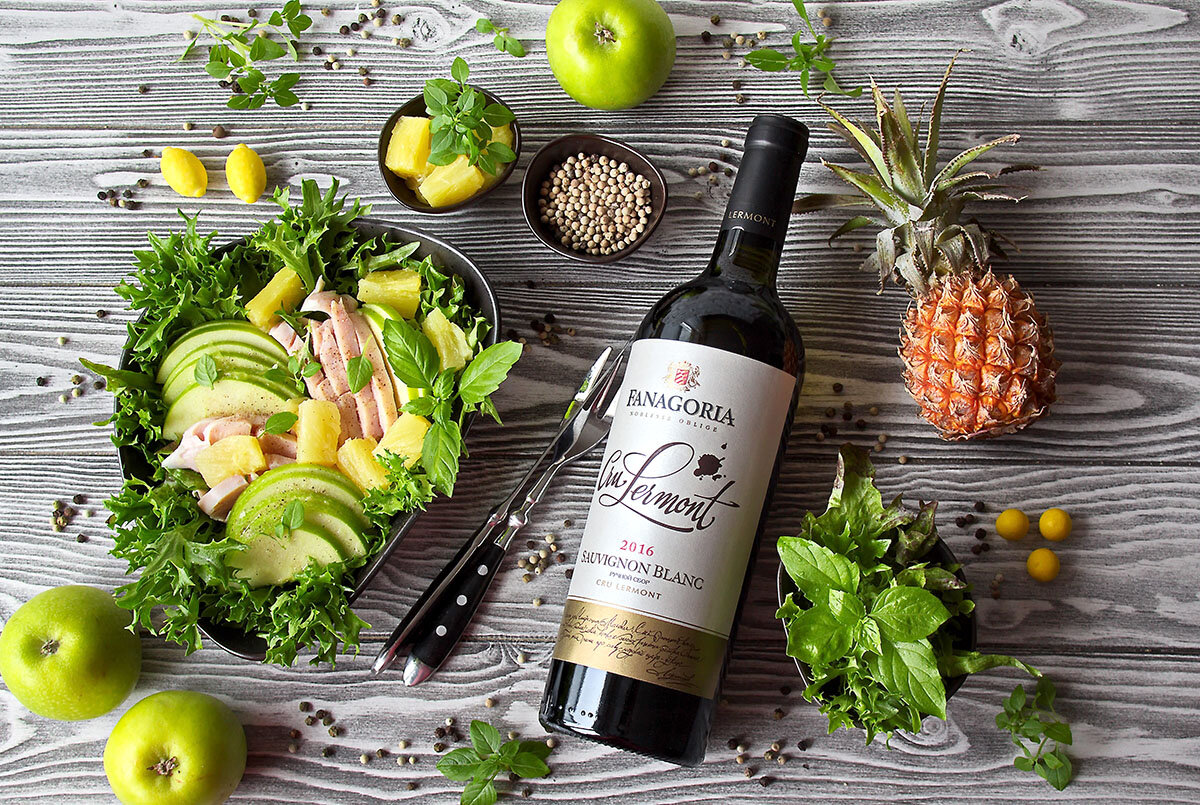 Встречаем весну! Ошеломляющий гастрономический союз яблока, ананаса и белого перца! И эта обыденность создает изумительное блюдо под бокал выдержанного сухого вина «Fanagoria Cru Lermont Sauvignon Blanc» с фруктово-цитрусовыми оттенками, которые подчеркнут вкусовую палитру салата.