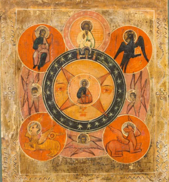В основе композиции таких икон лежит повторяющийся мотив круга. В центральном, круге изображается Иисус Христос в иконографическом образе Спас Эммануил с благословляющим жестом. Из этого круга по диагонали исходят 4 луча. На их вершинах находятся 4 маленьких круга, внутри которых находятся аллегорические символы евангелистов (см. тетраморф ) либо, реже, — изображения самих евангелистов.