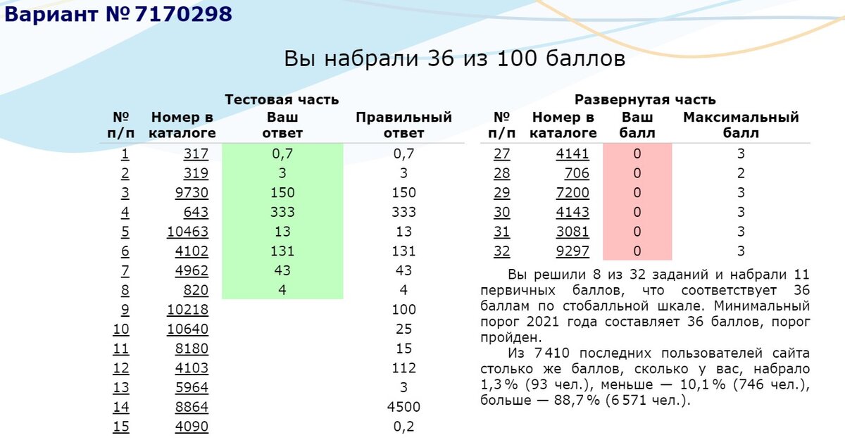 Несмотря на то, что в физике больше заданий, то есть 32 штуки, для проходного балла достаточно решить столько же заданий, сколько и в математике, то есть 8 штук. Таким образом вы набираете проходной балл в 36 баллов.
