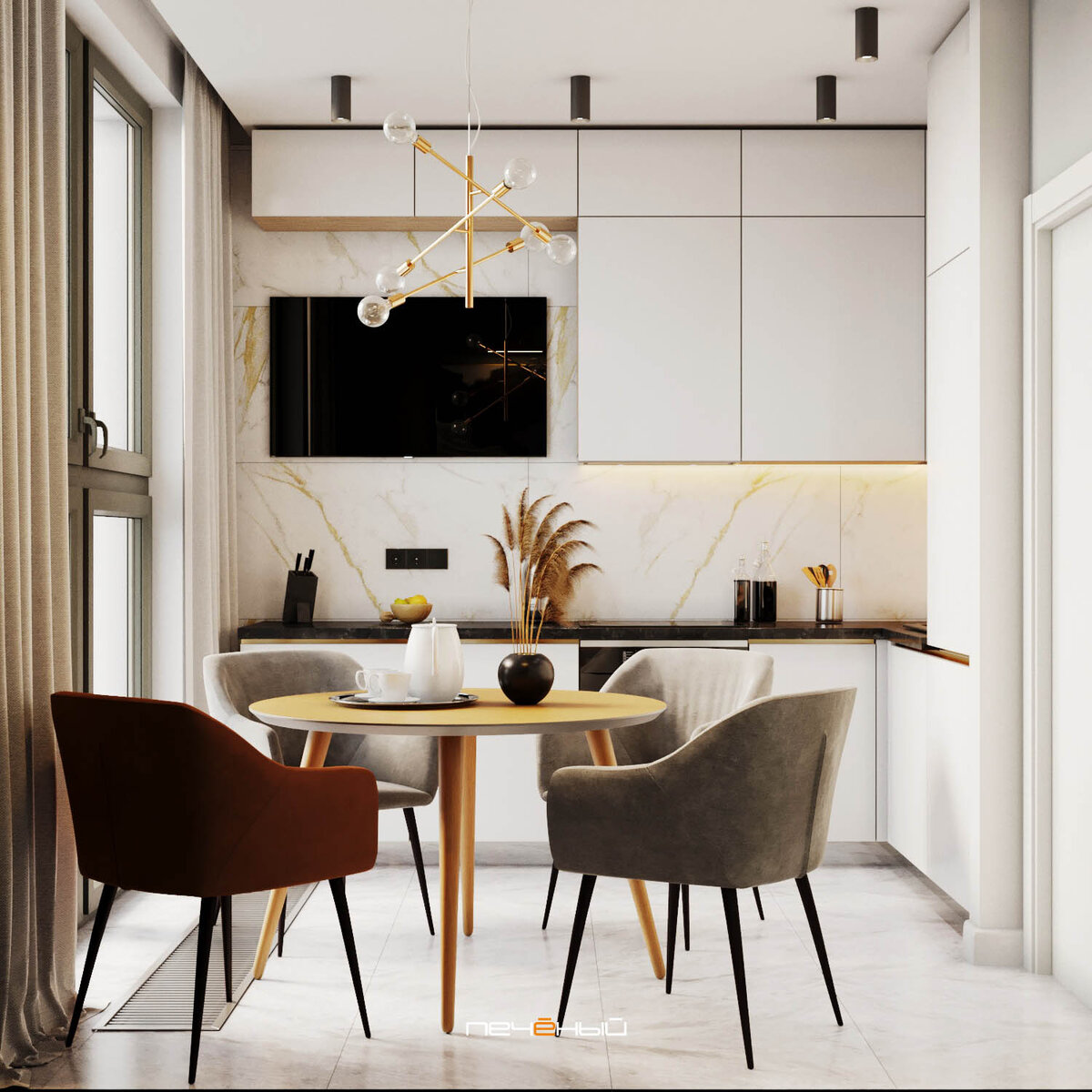 Минималистичные белые фасады здесь выступают как нейтральный фон, на котором ещё более выигрышно и стильно смотрится столовая зона и акцентная стена.