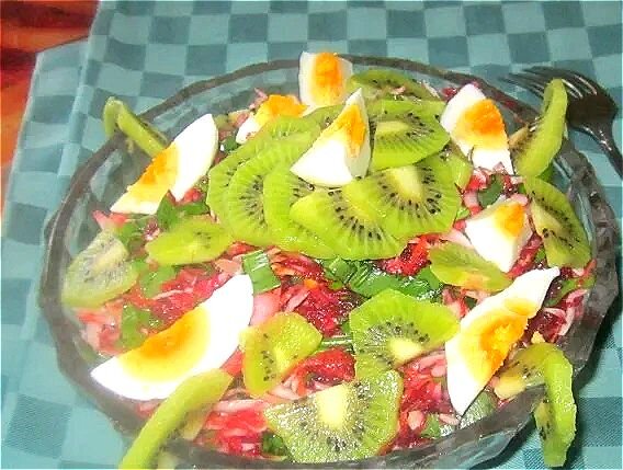 - Аппетитный салат с киви черемшой и яйцами готов и его можно подавать к столу. Вкусно, красиво, экзотично и очень необычно, правда?