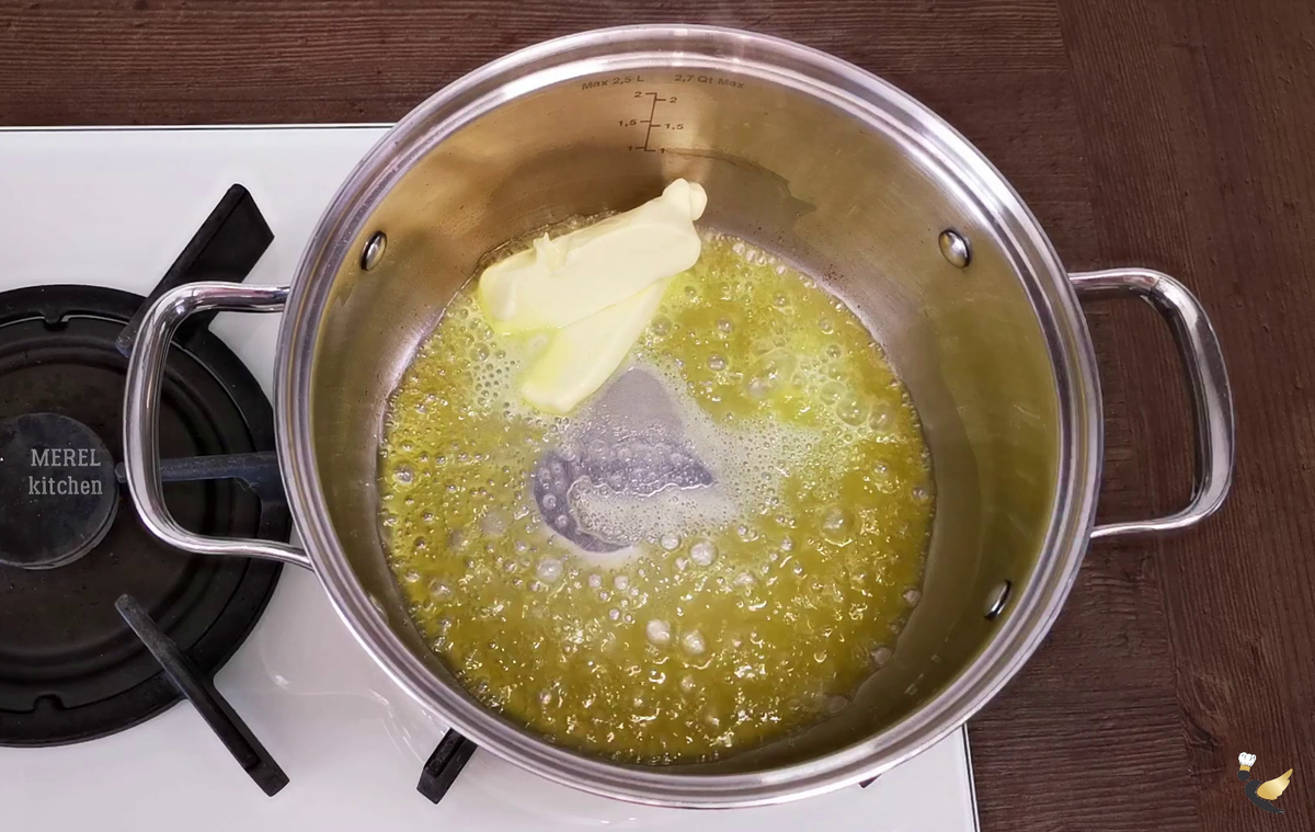 Для приготовления Турецкого чечевичного супа я нагреваю в кастрюле объемом 2,5 литра две столовые ложки оливкового масла и добавляю к нему сливочное масло 50 граммов.